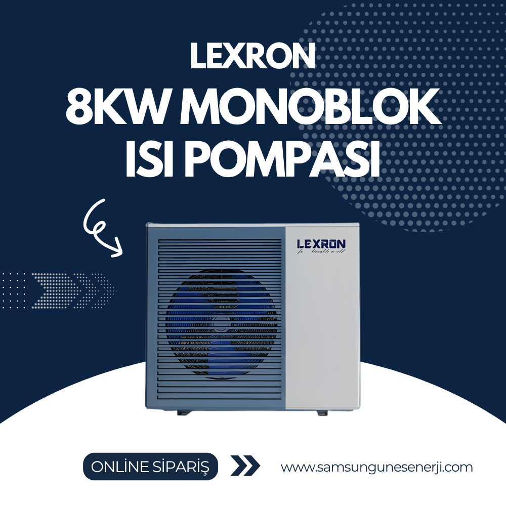 Lexron 8kW monoblok ısı pompası, yüksek verimli ısıtma ve soğutma sağlayarak enerji tasarrufu sunar. Ev ve ticari kullanım için idealdir.
